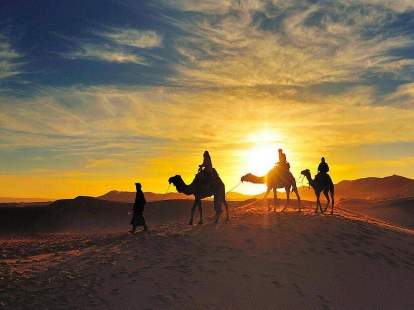 Today we’ll explore the desert region around the Erg Chebbi desert dunes. You’ll have the opportunity to see the nomad’s way of life and the marvelous contrast of the desert. We will visit the black village of Khamlia; where we’ll indulge in the music of the Gnawa. For lunch, we’ll delight in a traditional Berber Pizza in the ancient capital of Rissani. In the late afternoon, we’ll ride on camelback to watch the sunset over the dunes and spend the night in the desert camp. We will have a traditional Tagine dinner, drink delicious local mint tea, and listen to traditional Berber music around a campfire while watching the stars and the rising moon in the amazing Sahara desert.